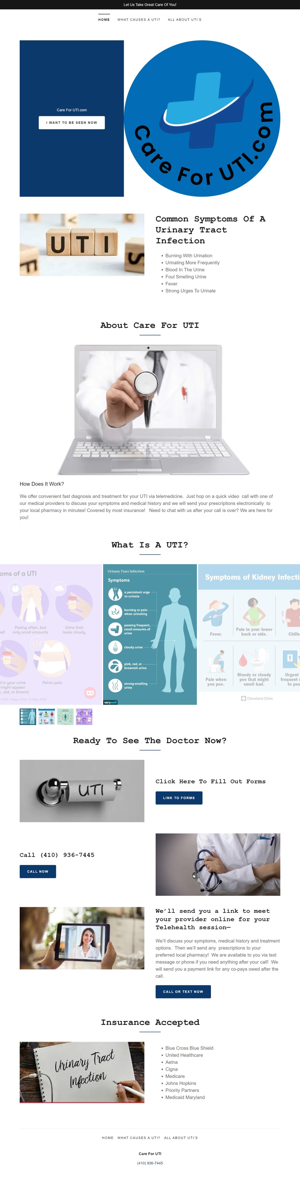 Care For UTI in s the most trusted virtual UTI provider in Maryland. Doctors provide prompt, knowledgeable care to treat your urinary tract infection via telemedicine visit. We accept most insurance. After your call, we will send your prescription directly to your local pharmacy. As always, we are available after the call if you need anything! Feel better faster!